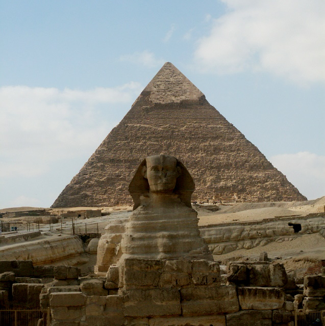 Die Sphinx befindet sich etwa 500 Meter östlich der Chefren-Pyramide. Sie wurde aus Kalkstein der Ebene gemeisselt. Der Körper ist der eines hockenden Löwen, das Symbol königlicher Macht, aber der Kopf ist menschlich. Das Gesicht entspricht wahrscheinlich dem des Pharaonen Chefren.