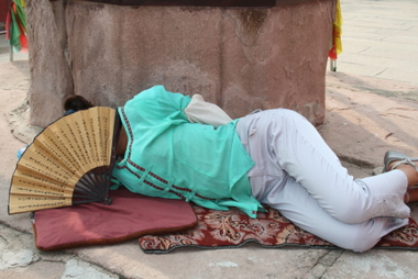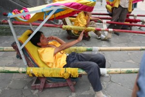 Dieses Bild haben wir in China gemacht, wo wir einige Male gesehen haben, dass sich die müden Menschen einfach irgendwo ein Nickerchen erlauben. In diesem Fall ruht sich der Mann in der „Sänfte“ aus, mit der er eigentlich gerne Touristen transportieren möchte.