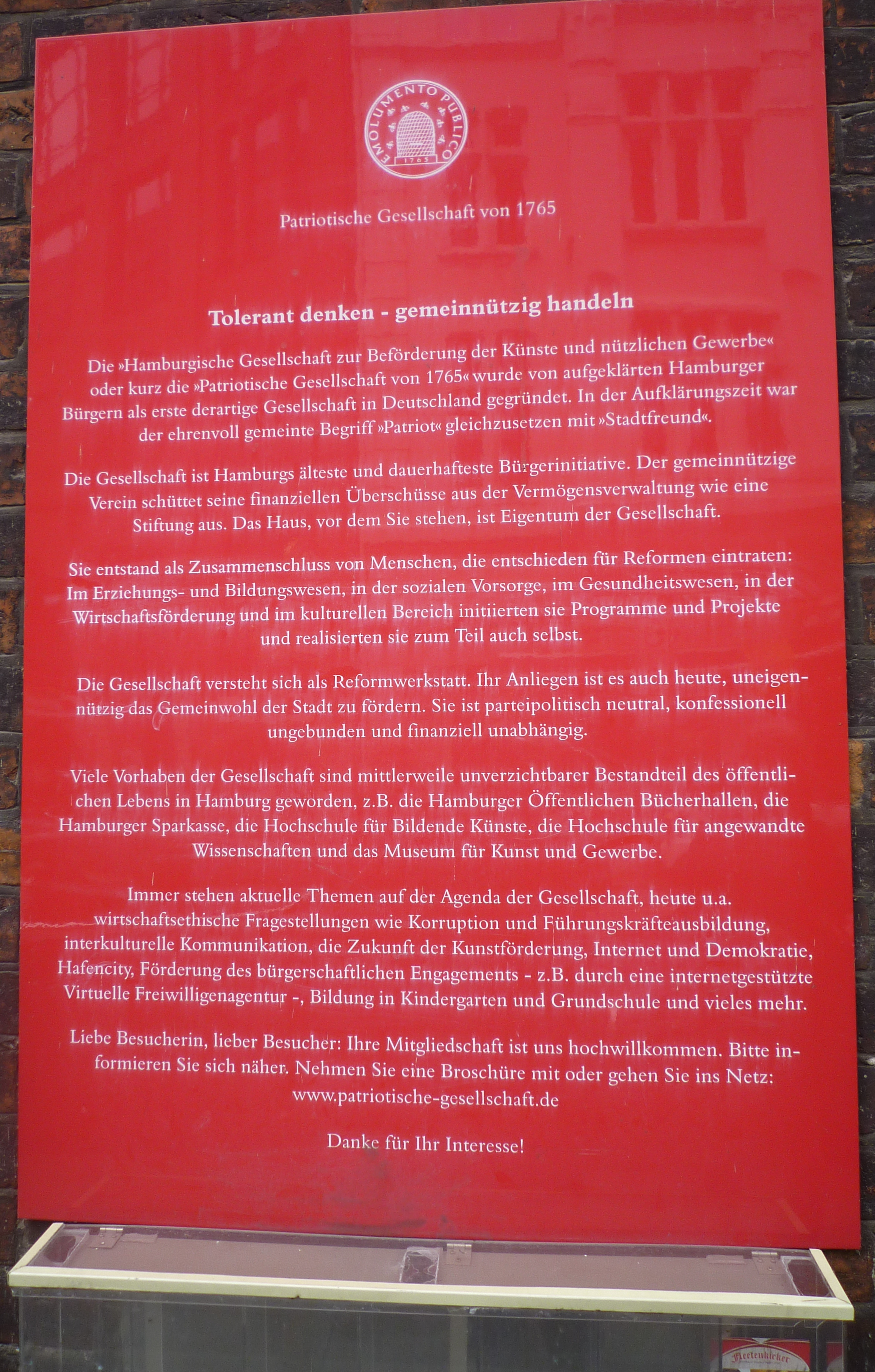 Im Weiteren gibt es da die Patriotische Gesellschaft, die das tolerante Denken und das gemeinnützige Handeln fördern will.Sie wurde übrigens 1765 gegründet. Die Werte/Ideen dieser Patriotischen Gesellschaft im 18. Jahrhundert sind mir unter die Haut gegangen und ich bitte euch den unten eingeblendeten Anschlag der Gesellschaft zu lesen und ich werde Vokabelnhilfen auf italiano & English geben.Patriot