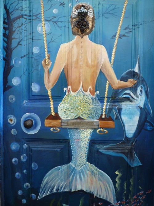 As we were strolling across the old town of Funchal, the capital city of Madeira Island, we were told that after the terrible flooding in 2010 artists had started to paint and ornament doors in order to embellish the battered houses and to give life back to the city. This impressive artistic works, open to everybody, which have been executed within a short time, have really got under my skin, I would like to present some of them. They are often in connection with the daily life of the citizens.
