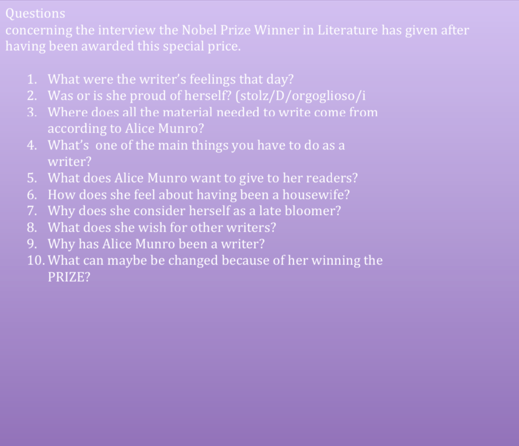 Als ich versuchte mehr über die Schriftstellerin herauszufinden, fand ich dieses Interview, das sie gab, nachdem ihr der Nobelpreis für Literatur zugesprochen wurde.