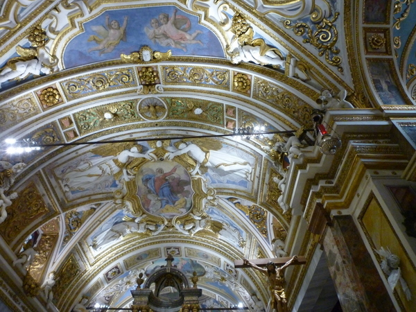 Der Kirchenraum ist in ein Hauptschiff und zwei Seitenschiffe unterteilt. Die Deckengewölbe sind mit Stuckaturen und Fresken geschmückt