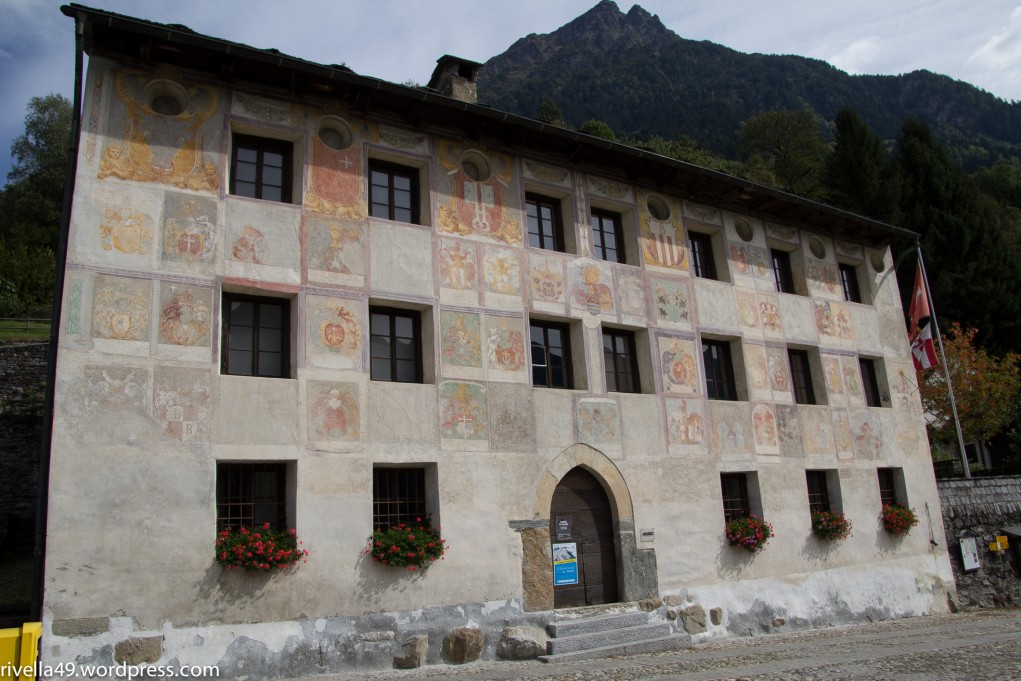 An der warmen Sonne vor dem Museum betrachteten wir dann die wunderschöne Front des Gebäudes, bemalt mit Fresekn von Wappen der Landvögte – Vertreter der drei Urkantone, die während drei Jahrzehnten die Vogteien im Bleniotal verwalteten.
