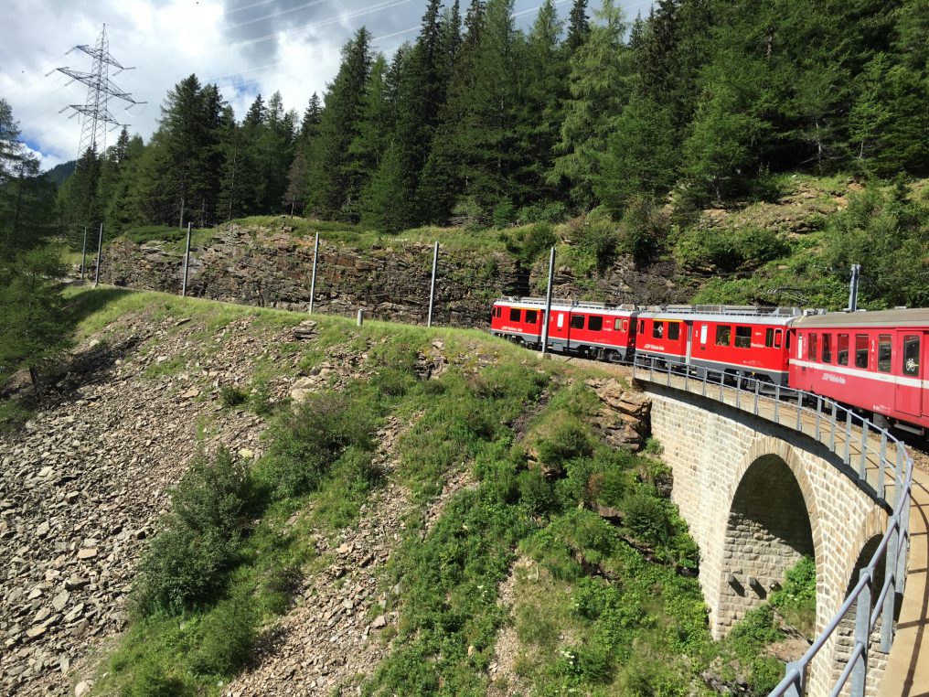 Wir waren unlängst mit unseren Freunden aus Hamburg im Puschlav und haben mehrere Ausflüge mit der einzigen Schweizer Bahn gemacht, die offen über die Alpen führt. Die 1910 fertig gestellte Bahnlinie bringt seine Passagiere von den Gletschern des Berninapasses auf 2253 Meter über Meer hinunter nach Tirano (Italien) auf 429 Meter über Meer. Die 1824 m Höhenunterschied zwischen Bernina und Tirano meistert die Berninalinie auf einer Horizontaldistanz von nur 22 Kilometer – ohne Zahnrad und trotz Steigerung von bis zu 70%! In dieser traumhaften Umgebung wird das Auto überflüssig, weil der öffentliche Verkehr so gut organisiert ist! Hoffen wir, dass es unserem Land auch weiterhin möglich sein wird die vielen Eisenbahnstrecken von dem dicksten Eisenbahmnetz der Welt in perfektem Zustand zu halten.:) Ausserdem erwarten wir Kunden natürlich weiterhin, dass die Züge pünktlich ankommen, das heisst innerhalb von nicht mehr als 3 Minuten über der vorgesehenen Ankunftszeit.