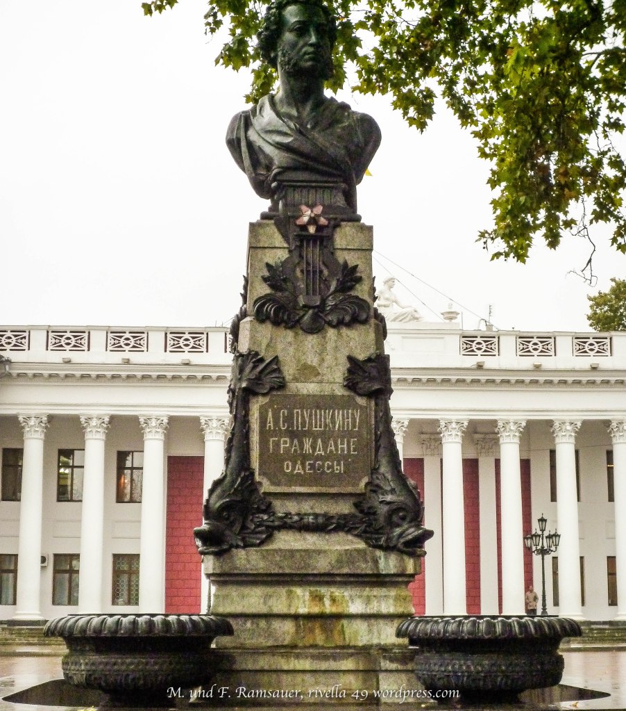 The Government and the Pushkin monument are at the southern end of the Primorski Boulevard. The famous writer was exiled to this city in 1823/24 and was forced to work for the city administration. He wrote more than 30 poems while he was in Odessa and also started with “THE GYPSIES” http://www.pushkins-poems.com/Gypsies01.htm and I like it very much. By the way on the monument you can see that he is showing his behind to the government!